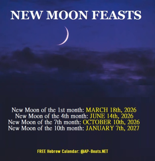 New Moon of the 1st month: MARCH 18th, 2026 New Moon of the 4th month: JUNE 14th, 2026 New Moon of the 7th month: OCTOBER 10th, 2026 New Moon of the 10th month: JANUARY 7th, 2027